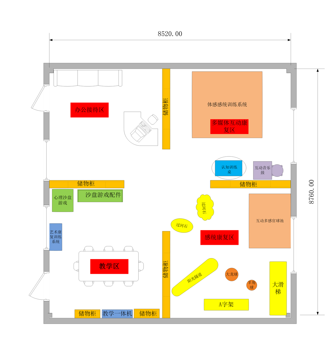 功能說(shuō)明:用于對(duì)學(xué)生的心理輔導(dǎo)與訓(xùn)練,情緒疏導(dǎo)與放松,可用作心理疏導(dǎo)的核心區(qū)域。