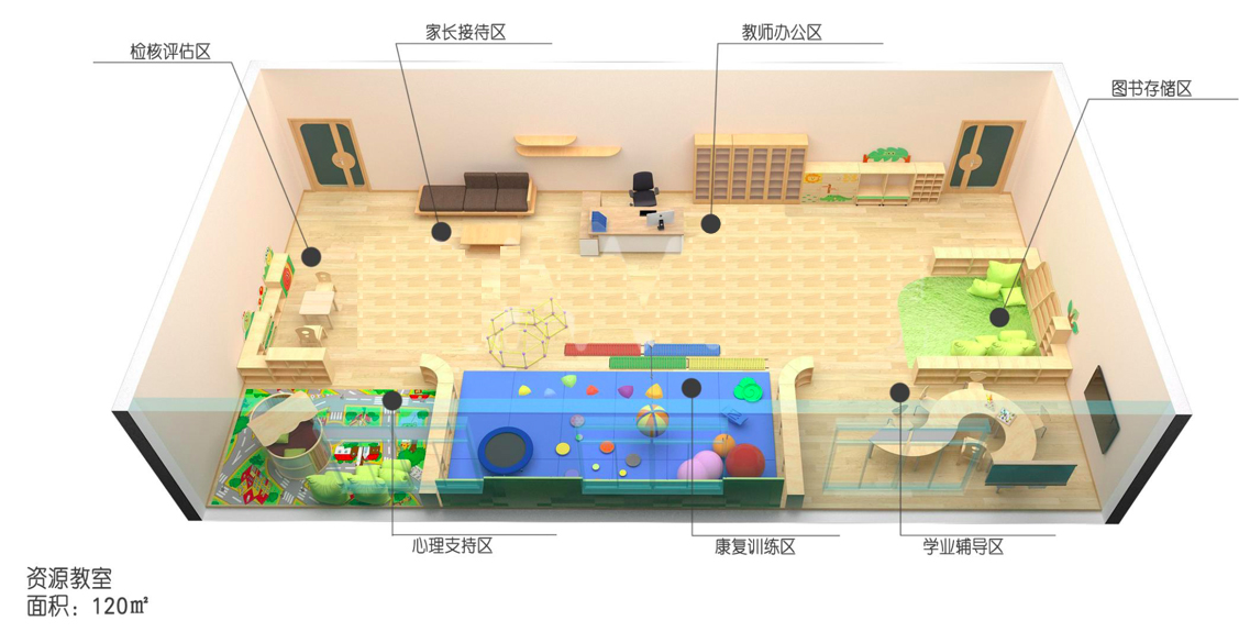 根據(jù)教育部辦公廳《普通學(xué)校特殊教育資源教室建設(shè)指南》的相關(guān)規(guī)定,結(jié)合建設(shè)資源教室的實(shí)際需求,資源教室功能分區(qū)可劃分為五大區(qū)域:家長(zhǎng)接待區(qū)、教師辦公區(qū)、學(xué)業(yè)輔導(dǎo)區(qū)、康復(fù)訓(xùn)練區(qū)、心理支持區(qū)。各區(qū)域承擔(dān)不同的教育教學(xué)功能。